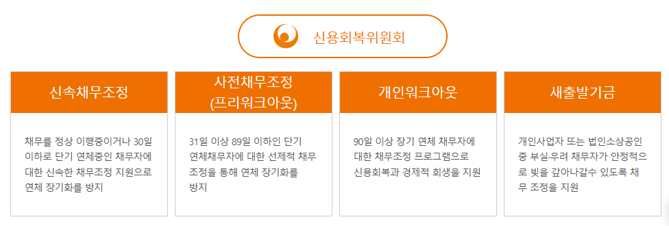 신용회복위원회는 개인의 연체 기간 및 상황에 따라 아래와 같은 맞춤형 채무조정 프로그램을 제공합니다.